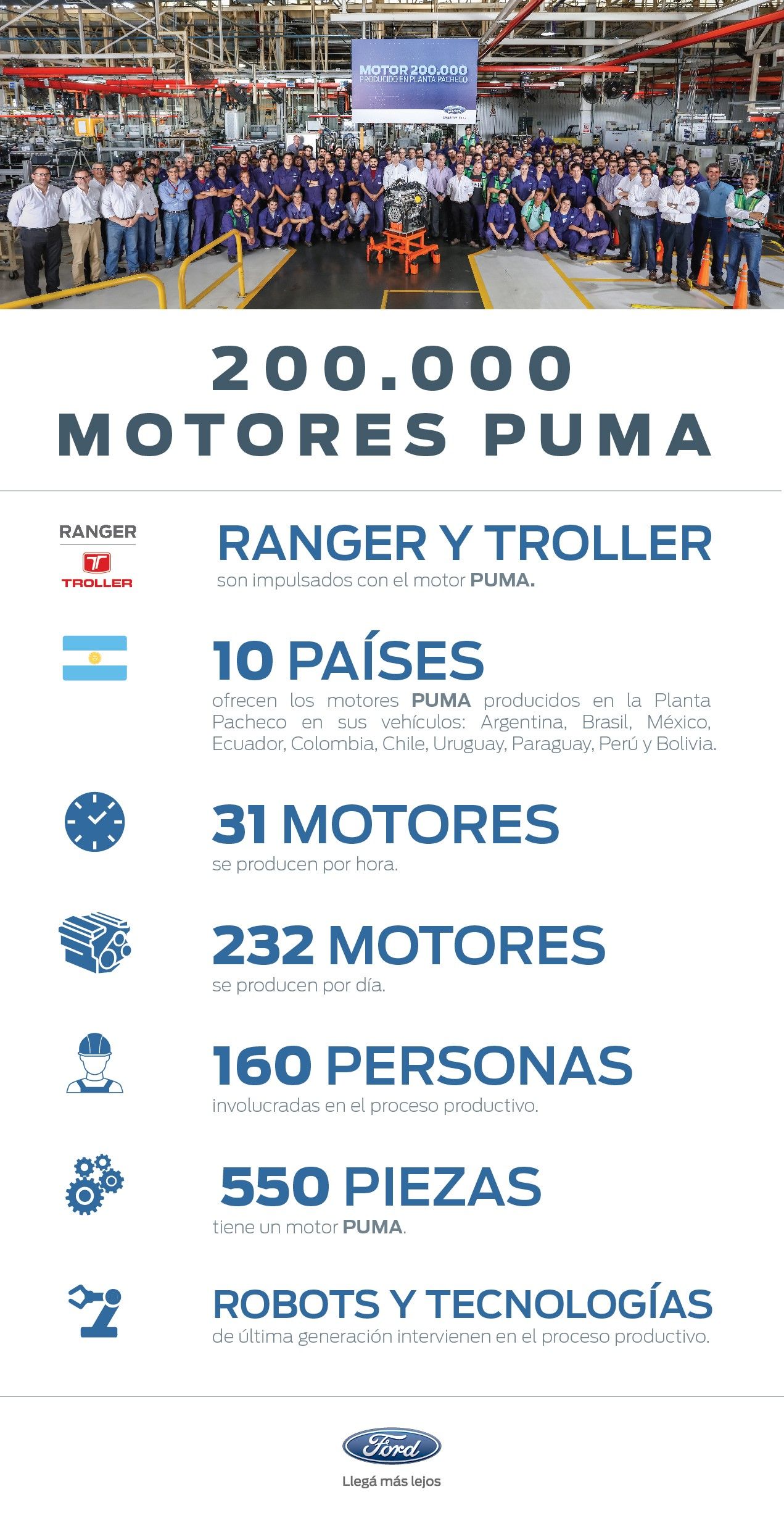 En la planta de motores trabajan 160 personas, aplicando tecnologías de última generación, que incluyen diferentes robots en distintas etapas de la línea de producción, como en la colocación de selladores y la máquina lavadora de blocks y cigüeñales. La capacidad productiva de la planta Pacheco es de 232 motores diarios, lo que se traduce en 31 motores por hora.