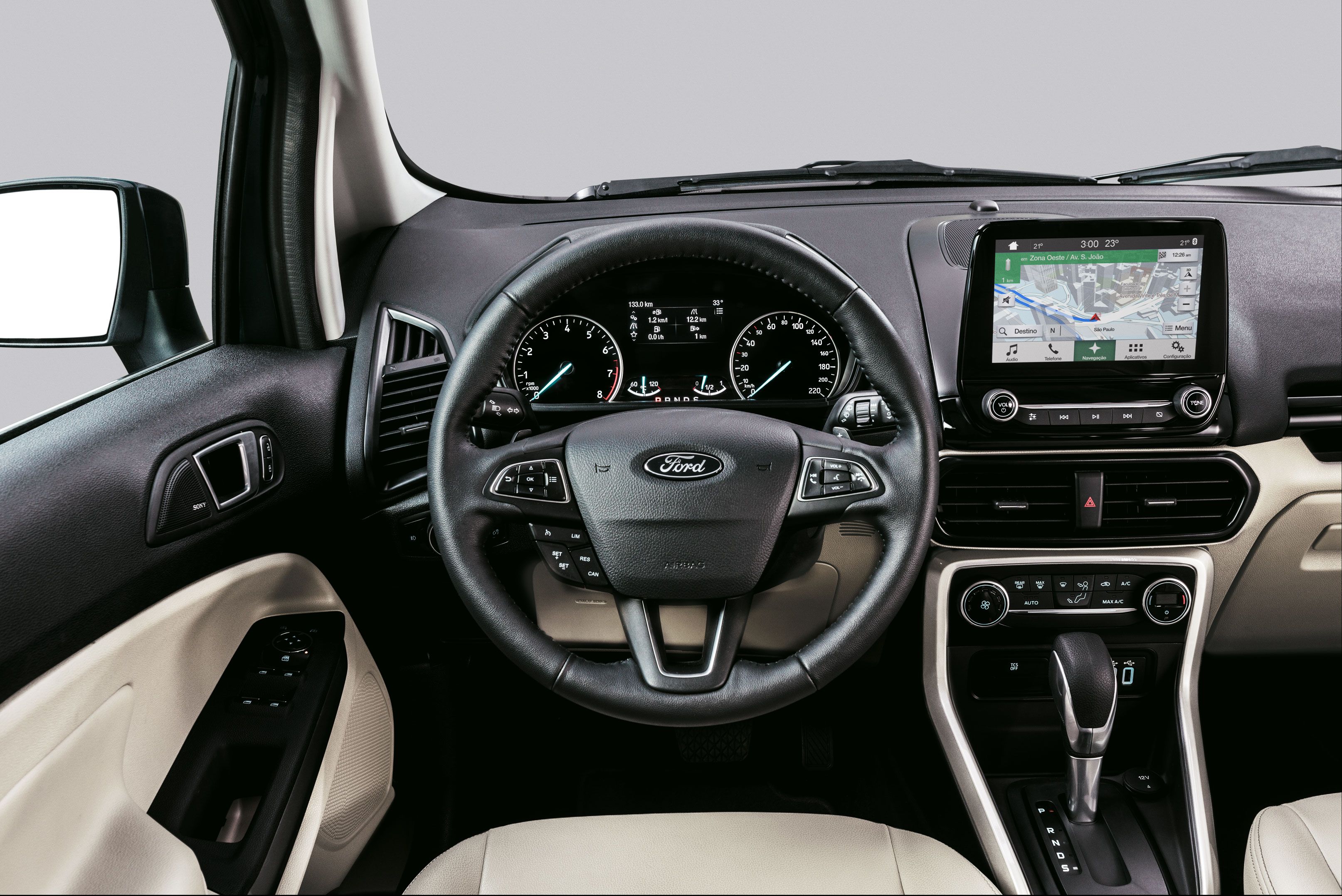 La Nueva EcoSport llega para elevar la vara de su segmento con un exigente nivel de calidad en sus terminaciones e incorporando las últimas tecnologías disponibles en materia de conectividad y seguridad. En su interior, se destaca una nueva pantalla flotante capacitiva de 8” de alta resolución que acompaña la introducción del SYNC III compatible con Apple Car y Android Auto. El techo solar, las levas al volante y el apoyabrazos deslizante con compartimiento integrado son partes de las novedades que pueden verificarse a simple vista en el nuevo interior de la SUV compacta de Ford. Por su parte, el conductor descubrirá un nuevo y elegante módulo de información que incluyen velocímetro, tacómetro y diversos indicadores.
