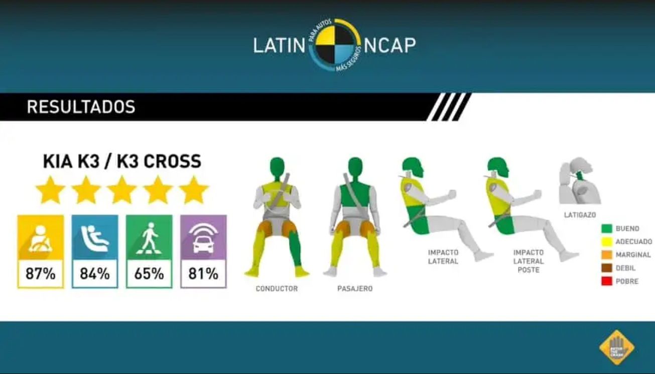 El Programa de Evaluación de Vehículos Nuevos para América Latina y el Caribe, Latin NCAP, presentó la tercera ronda de resultados del año 2024 con un sorprendente y alentador resultado de cinco estrellas para el Kia K3/K3 Sedán y el K3 Hatchback/K3 Cross. El modelo que se produce en México alcanzó las cinco estrellas, con 87.08% de protección para Ocupante Adulto, 83.67% en Ocupante Infantil, 65.4% en Protección a Peatones y Usuarios Vulnerables de las Vías y 80.84% en Asistencia de Seguridad.