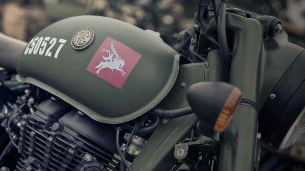 Cada una de las 1.000 nuevas motocicletas Classic 500 Pegasus de edición limitada luce un emblema Pegasus marrón y azul, la insignia oficial del Regimiento de paracaidas en el tanque de combustible junto con un número de serie individual. La famosa calcomanía de Royal Enfield «Made Like a Gun» en la caja de la batería es otro recordatorio del legado de la máquina.