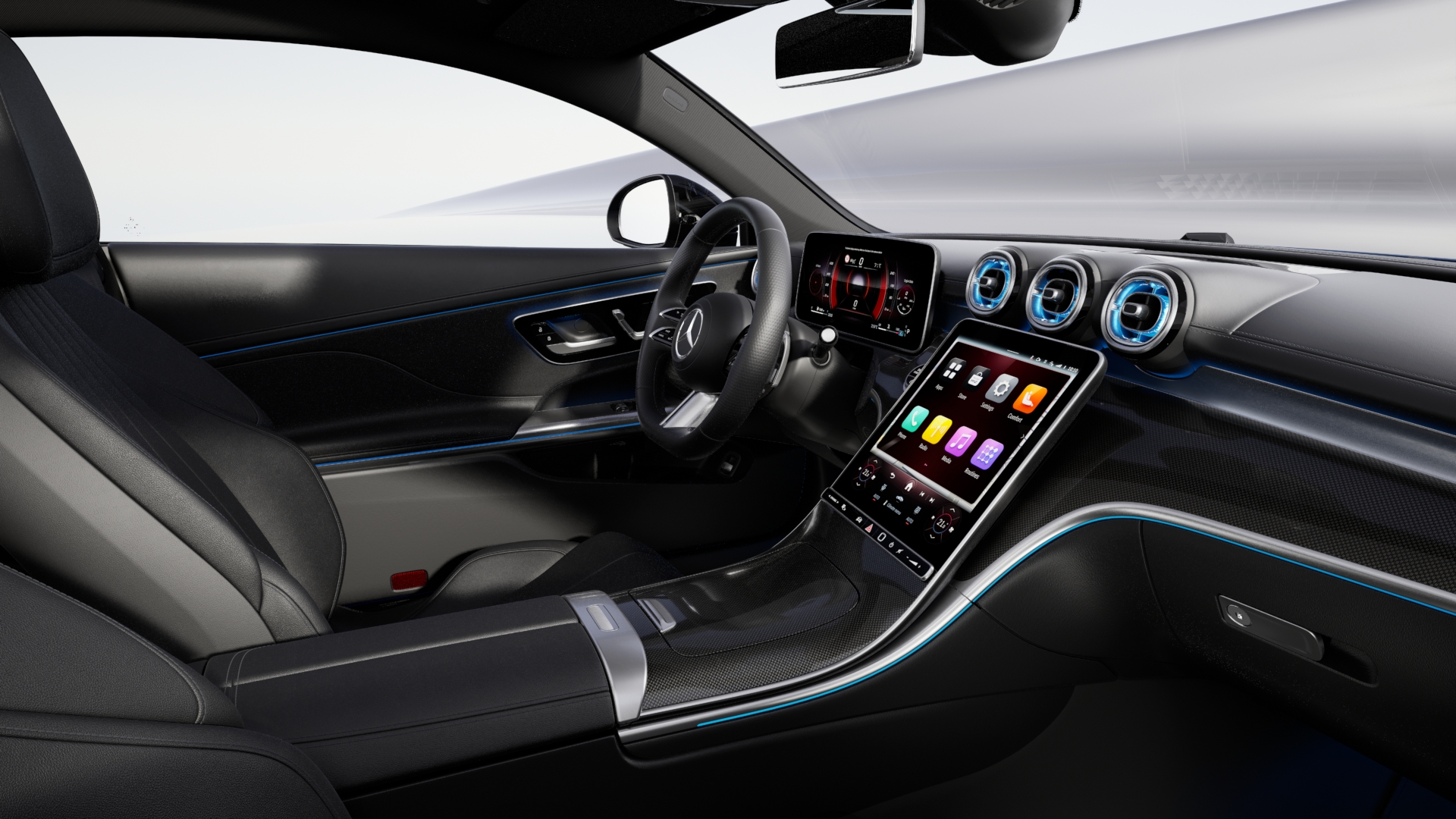 - Tapizado símil cuero ARTICO negro, volante deportivo multifunción forrado en napa y alfombrillas AMG.