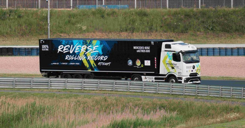 Mercedes-Benz Trucks estableció un nuevo título GUINNESS WORLD RECORDS con su camión eléctrico de largo recorrido eActros 600, al recorrer 124,7 kilómetros marcha atrás, incluyendo un semirremolque. Con esta hazaña, superó en unos 36 kilómetros el récord anterior, alcanzado en 2020 por un camión diésel en EE.UU. La iniciativa se realizó en la pista cerrada Motorsport Arena Oschersleben, en Sajonia-Anhalt, Alemania, en un trayecto que demandó 6 horas y 22 minutos, con una velocidad promedio de 20 km/h.