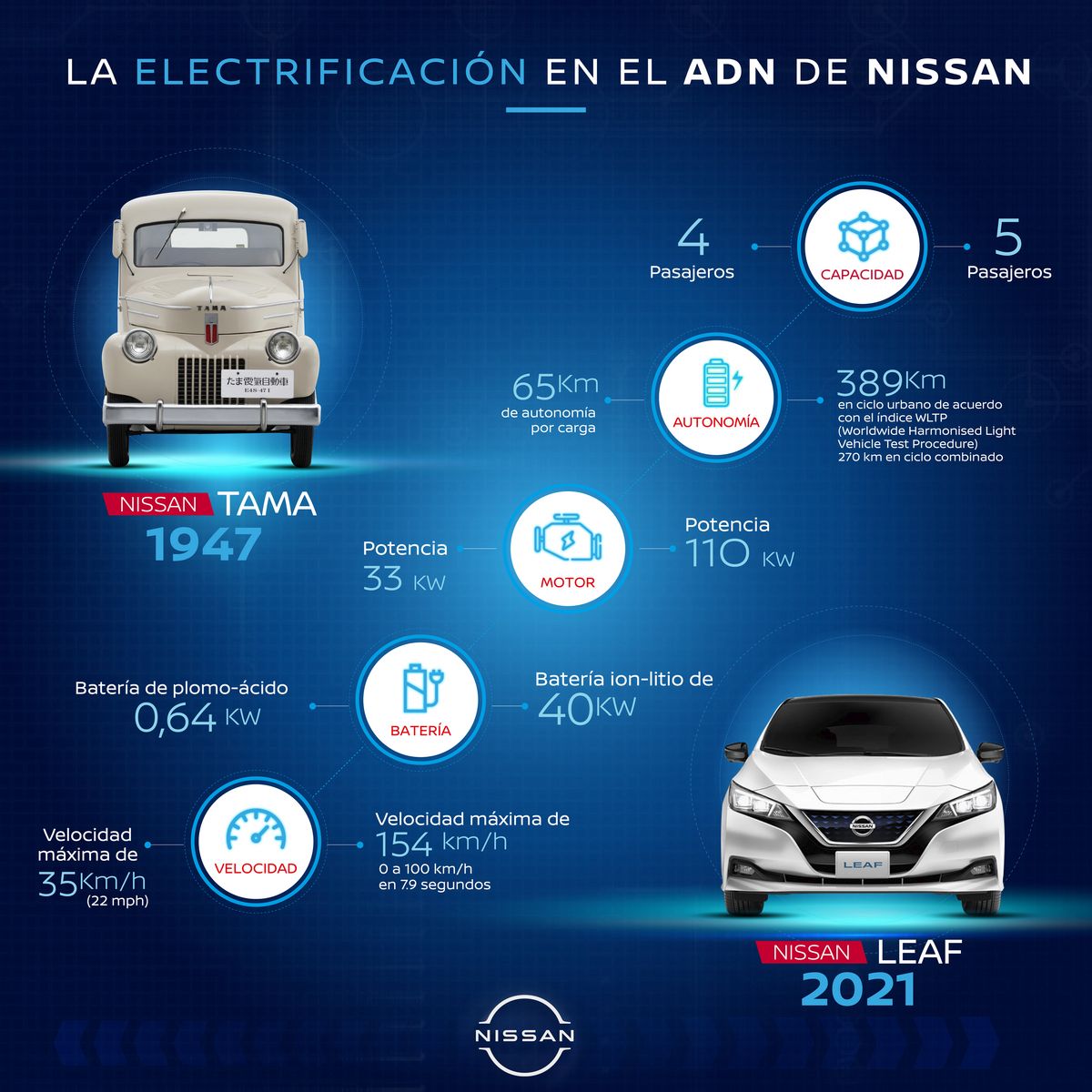 La historia de Nissan con la electromovilidad tiene más de 70 años y se remonta a 1947, cuando 200 empleados de la compañía de aviación Tachikawa se trasladaban a la compañía Tokio Automobile CO., Ltd. Esto significó el origen del Tama, uno de los primeros prototipos eléctricos y además un hito en la historia de Nissan como pionero en la creación y desarrollo de automóviles eléctricos.