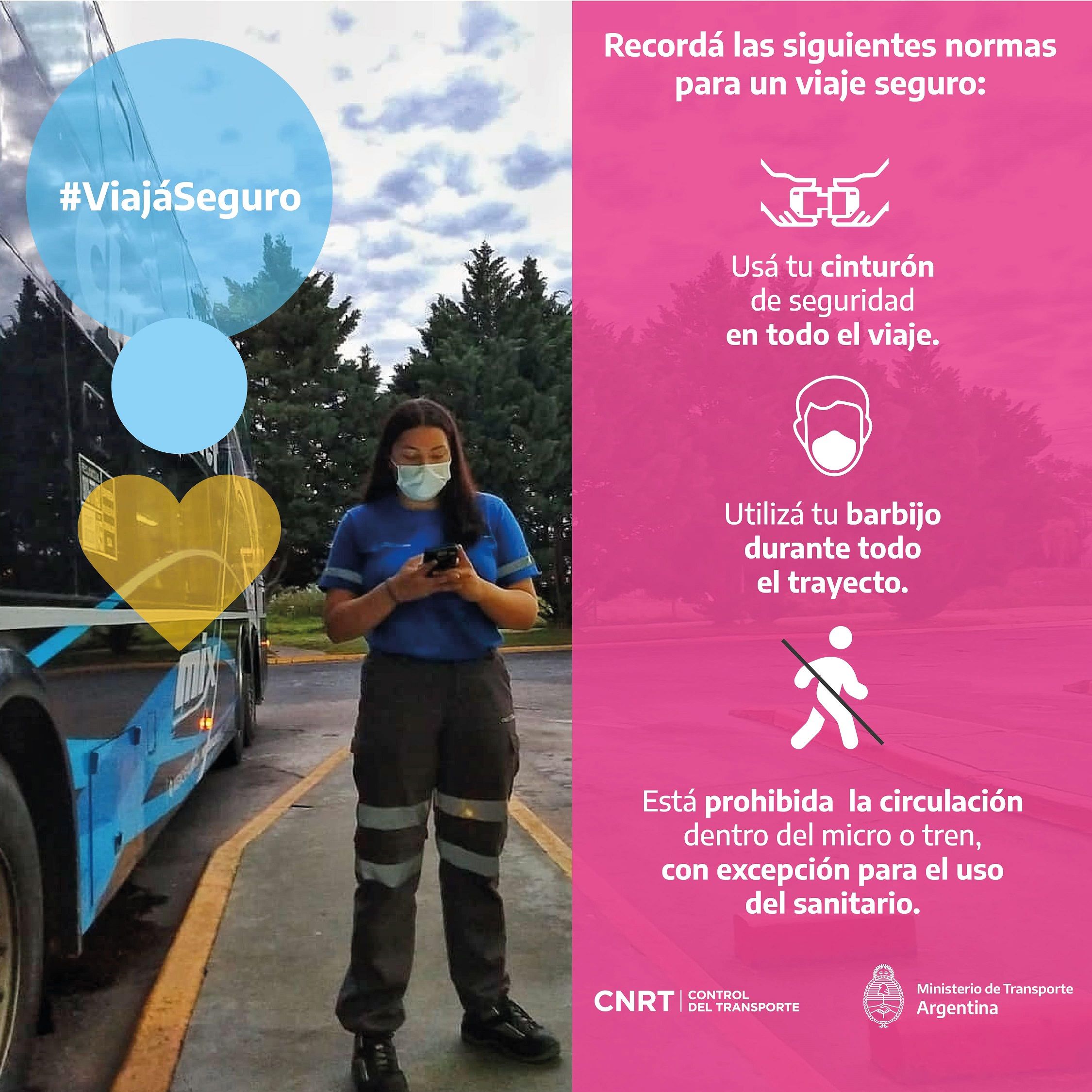 En marco del operativo Viajá seguro y los protocolos vigentes del Comité de Crisis y Prevención COVID-19, la Comisión Nacional de Regulación del Transporte (CNRT), organismo del Ministerio de Transporte, propone a los usuarios y usuarias de los servicios de transporte de pasajeros automotor y ferroviario, que tengan en cuenta los siguientes puntos para realizar un viaje: